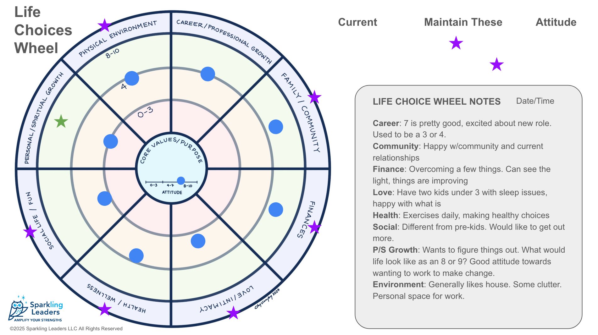 After all 8 quadrants have been evaluated, ask which areas your client wants to maintain and move the purple stars to those quadrants.